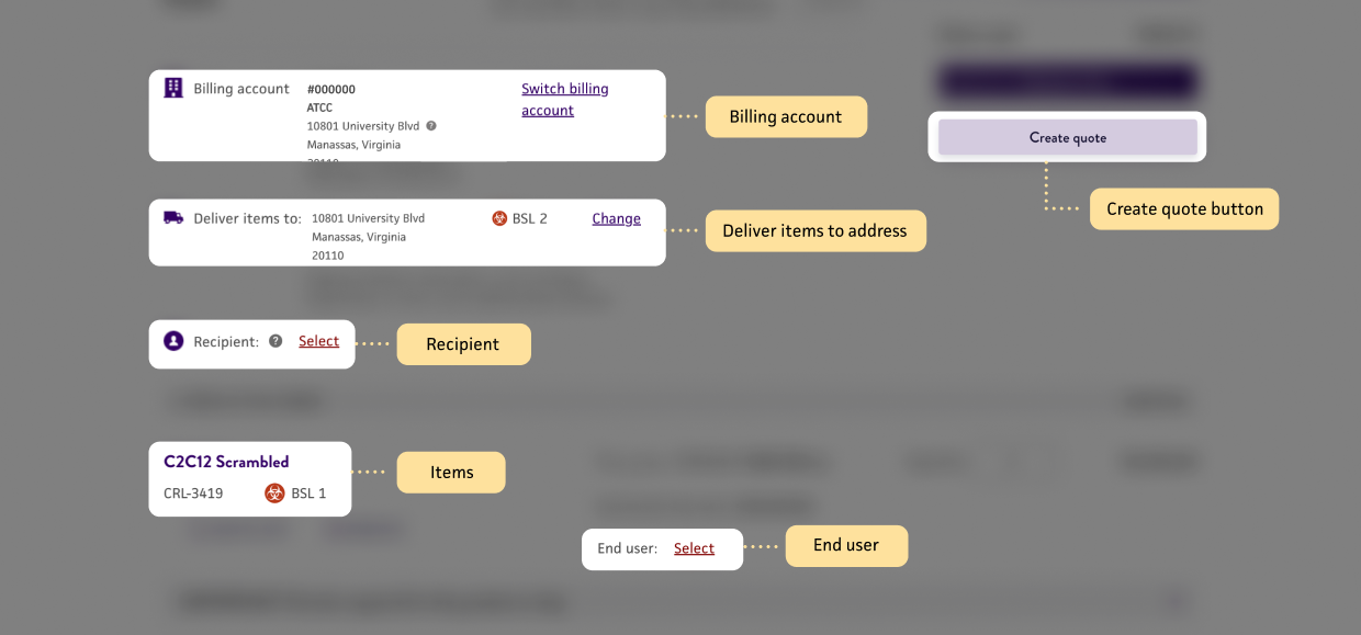 In your cart you will see your products, the billing account, the address where the items will be delivered, the Recipient who will receive the order, and the End user(s) who will use each product.